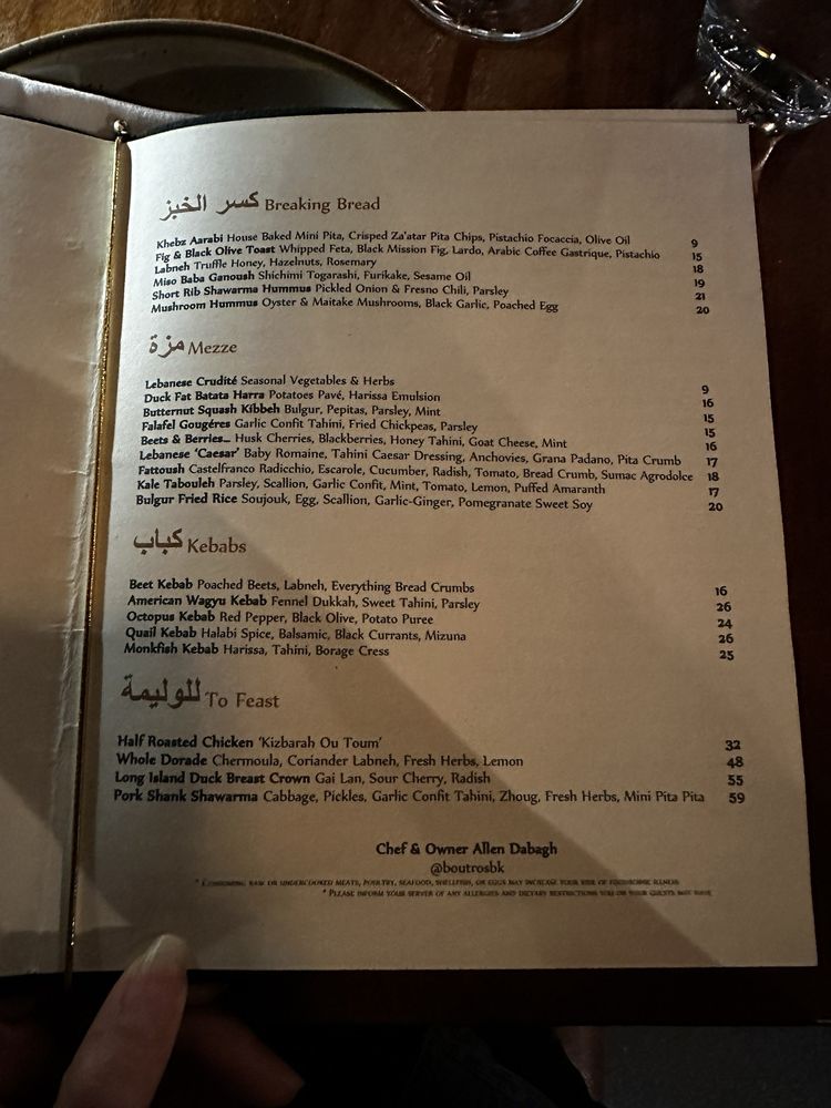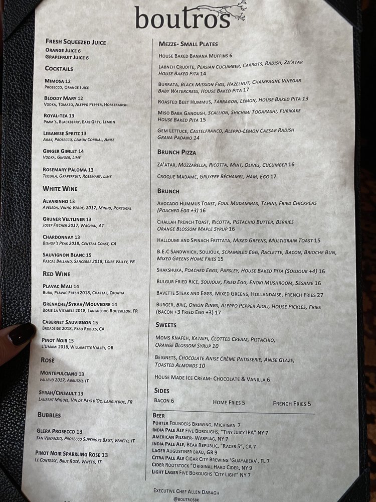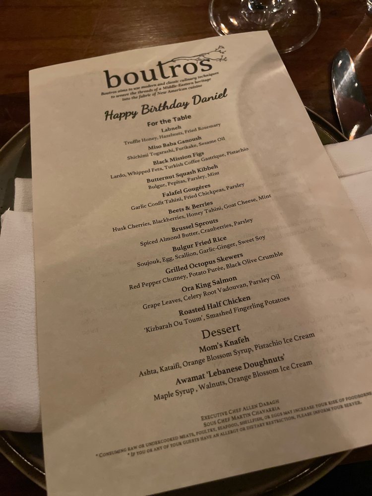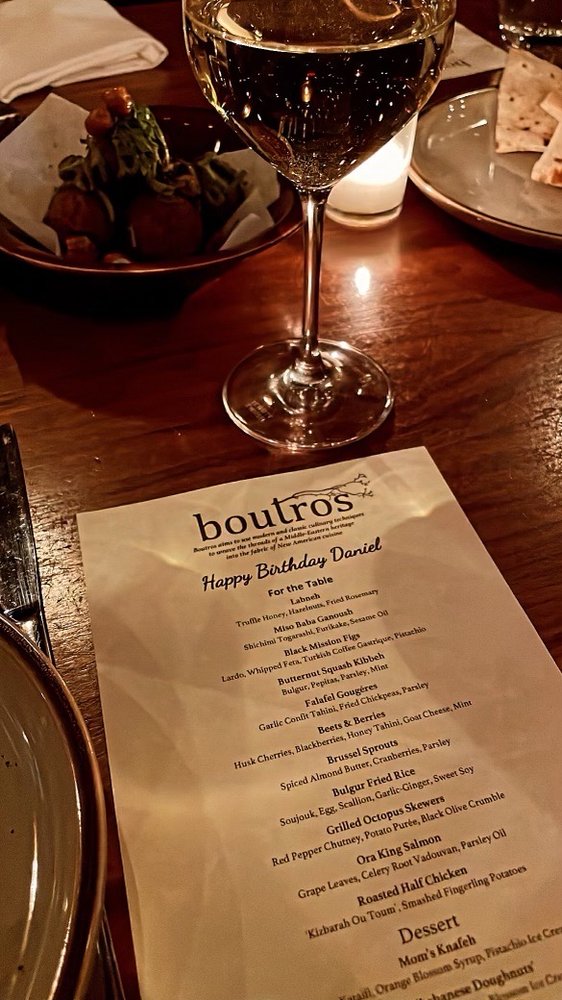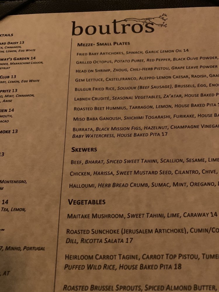 Introducing the menu at Boutros, a Lebanese, New American, and Cocktail Bar fusion in Brooklyn, NY. Offering a variety of utilities like reservation options, takeout, delivery, vegetarian choices, and more, Boutros creates a unique dining experience. With a diverse menu featuring Mezze like Labneh Dukkha and Roasted Beet Hummus, Large Plates like Wood Roasted Half Chicken and ShortRib Shawarma Sando, and delicious Desserts such as Knafeh Kataifi and Atayaf, Boutros brings Middle Eastern flavors to life. Customers rave about the creamy falafel, mushroom hummus, and unique cocktails like Cloud 9 and Berry Spritz. The cozy yet chic ambiance and attentive service make it a perfect spot for a special night out. Indulge in the flavors of Boutros and elevate your dining experience.