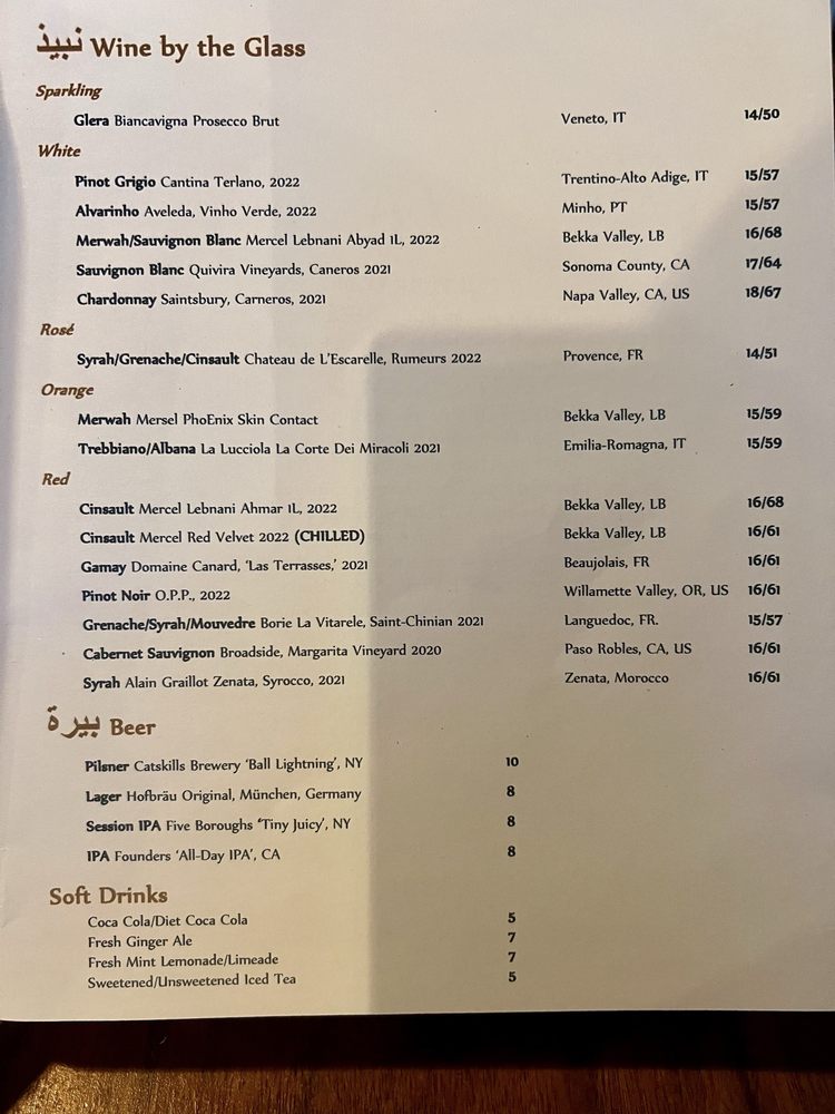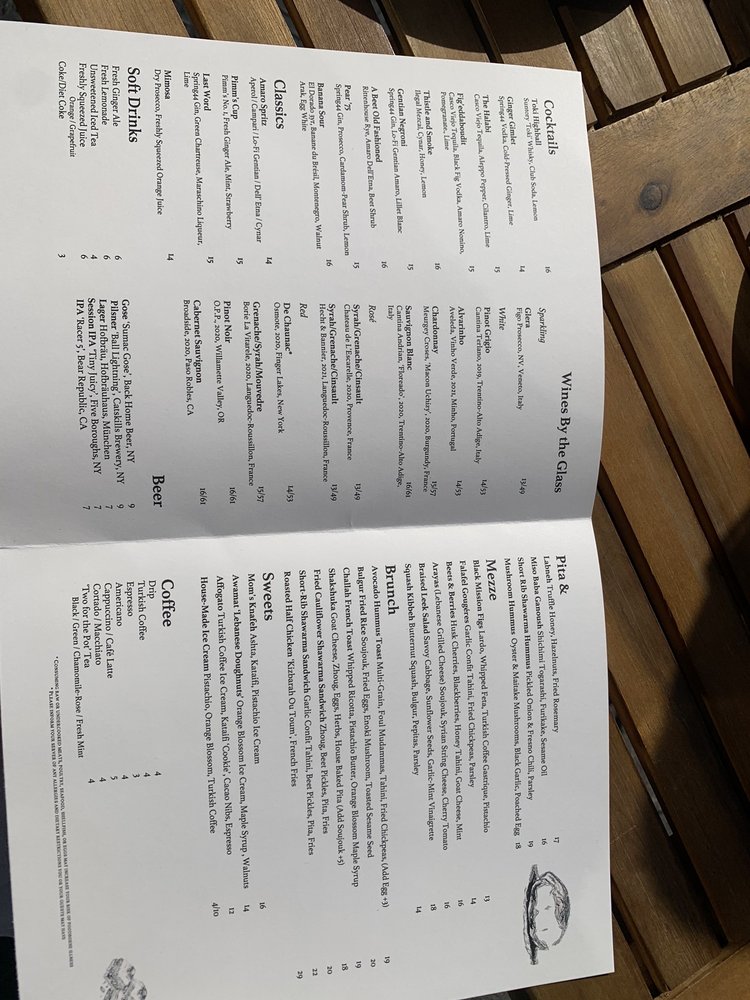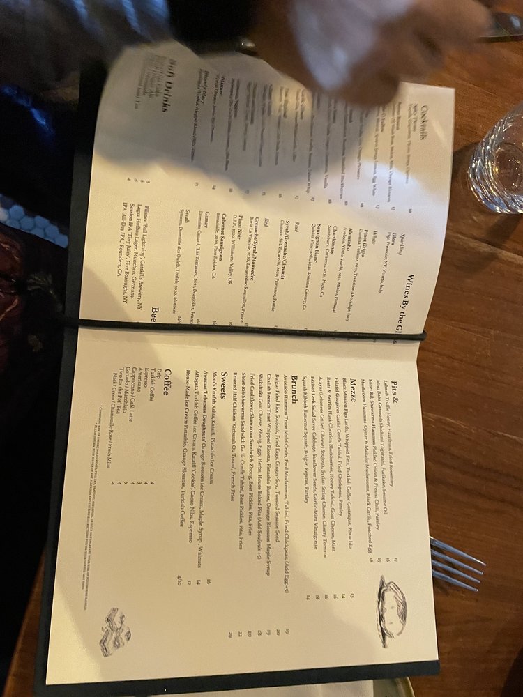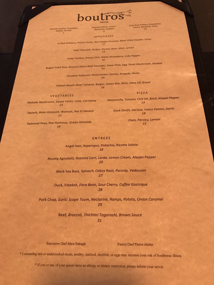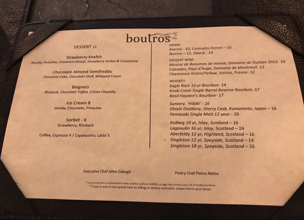 Introducing the menu at Boutros, a Lebanese, New American, and Cocktail Bar fusion in Brooklyn, NY. Offering a variety of utilities like reservation options, takeout, delivery, vegetarian choices, and more, Boutros creates a unique dining experience. With a diverse menu featuring Mezze like Labneh Dukkha and Roasted Beet Hummus, Large Plates like Wood Roasted Half Chicken and ShortRib Shawarma Sando, and delicious Desserts such as Knafeh Kataifi and Atayaf, Boutros brings Middle Eastern flavors to life. Customers rave about the creamy falafel, mushroom hummus, and unique cocktails like Cloud 9 and Berry Spritz. The cozy yet chic ambiance and attentive service make it a perfect spot for a special night out. Indulge in the flavors of Boutros and elevate your dining experience.